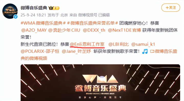 今年还拿下了微博音乐盛典年度新锐歌手的称号。